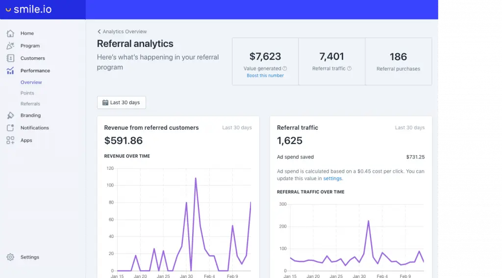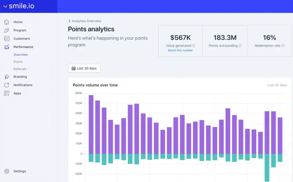 With the Free and Starter plans, this is about the extent of what you’ll be able to do with Smile (we haven’t covered the Referral program here, but this is fairly self explanatory). If you’re interested in seeing the impact your programs are having, you’ll only be able to see a very high level overview of results: how many program members you have, and how many purchases were driven by your points and referral programs. At higher levels, you’ll get more in-depth analytics—though you should understand that this just means they’re more in-depth than the overview. The data you get here isn’t exactly deep: you’ll learn how many points are out there, unredeemed, how much revenue the program generated for you, and get an idea of referral trends. These are helpful, but don’t justify the $150 jump in price from the Starter to Growth plan.