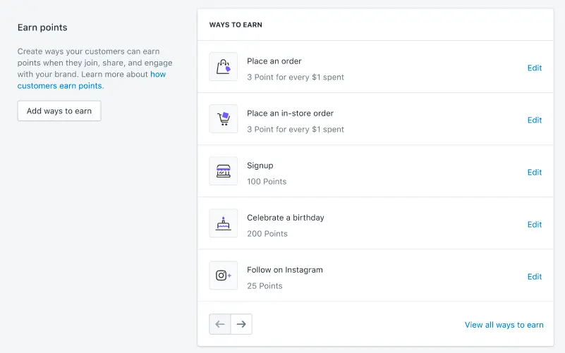 Having gone through the simple exercise of defining your points and customizing the look of Smile within your website, you’re brought to the admin panel where you can start building out your programs even more. There are other ways for customers to earn points, for example, that doesn’t require them to make a purchase. You can offer a signup bonus, as well as give incentives for follows, shares, and likes on social media. These are one-time only incentives to prevent abuse. You can also configure redemption so that points either get a discount via percentage or dollar amount, or even free shipping.