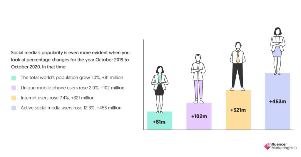 Social media's popularity is even more evident when you look at percentage changes for the year October 2019 to October 2020. In that time: