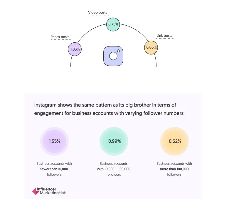 One of the more surprising benchmarks is that the average engagement rate for photo posts on Instagram is higher than for video or carousel posts.