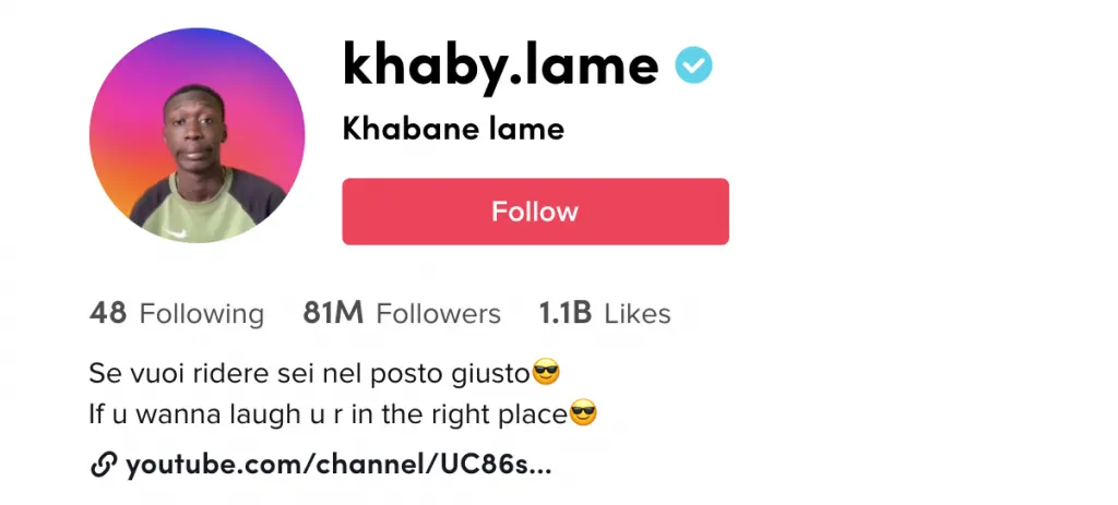 Khabane Lame (aka Khaby) was born in Senegal, but moved to Italy at the age of one where he still currently resides. The former CNC machine operator posts short comedy skits on TikTok about people who make simple tasks more difficult than they have to be. Popular across various social channels, his biggest following is on TikTok where he has more than 80 million followers and 1 billion likes.