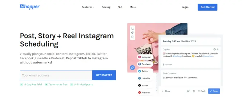 It lets you preview your Instagram feed, so you can understand what your Instagram feed will look like before you post your content. You can even schedule your first comment in advance, including your hashtags, for improved reach and engagement.