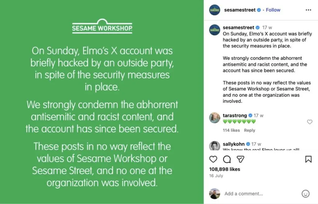 Elmo’s X account was hijacked in July 2025 and used to post antisemitic and racist comments.