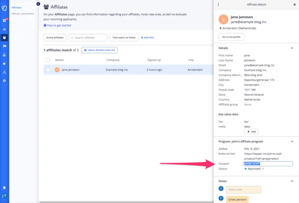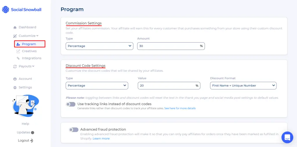 When you install the Snowball app with Shopify, setting this feature up will be the first thing you do after connecting the software to your store. And the setup is a breeze: define the discount for the coupon and the commission the affiliate gets, and every purchase after that results in a new coupon. One of the cool things about these coupons is that you can set the format for the code to include the customer’s first name and some unique numbers. Apart from being easy to remember, for a certain type of consumer having a personal coupon code can feel like clout, psychologically priming them to share it wherever they might want.