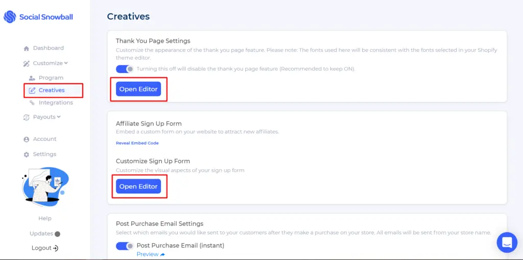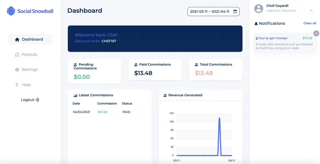 Snowball’s big feature is the way it automates affiliate recruiting by creating unique coupon codes for every customer that makes a purchase—whether they ask to be an affiliate or not. And this is a good strategy: with the coupon code and a pre-written social post all ready to go, sharing it is as simple as a click for your new affiliate.