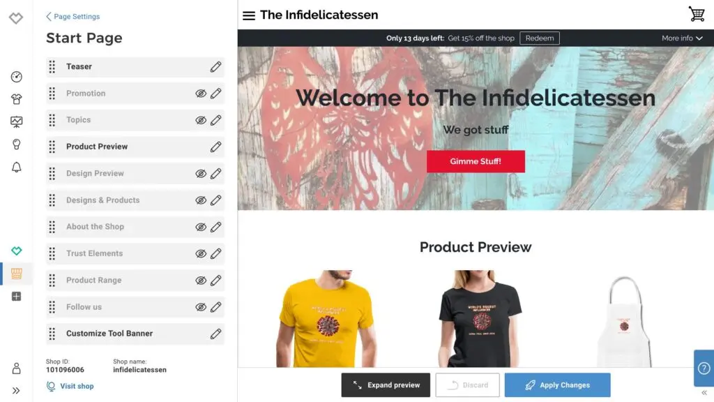 Once again, Spreadshop goes above and beyond what the competition offers in terms of customising your shop. The norm is to offer customisation of colors, a banner image, your logo, the page footer, and an About Us page. Spreadshop offers all this, but goes much further. There are a few themes to choose from, and each one can be customised to match the look/colors of your branding. The home page has a modular set up, allowing you to pick and choose what you’d like to display on the main page.