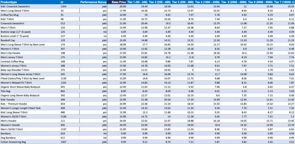 Setting up a shop is free; each item that you offer has a base price to you that’s deducted from the sale price. The price to your customers is determined by you, so you’re in charge of how much you can earn. Spreadshop will give you a suggested retail price, but you can raise or lower it as you see fit. But there are also performance bonuses tied to volume, so you earn higher margins the more you sell. For example, a Men’s T-shirt has a base price of $13.99. Sell 50 of them in a month, and the price goes down to $12.98. Sell 250 and the price goes down $12.37. Not all products are eligible for this, but most are. And since there a lot of products, each with seven tiers of prices beyond the base price, it would take too much time to list them all out here. Especially when Spreadshop has gone through the hassle of putting together this handy pricing table: