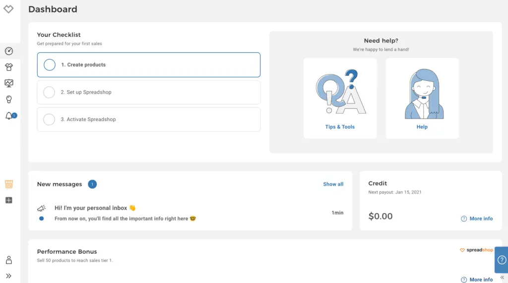 Log in for the first time, and you immediately get a taste of the ease of use. The dashboard orients you, providing you with a checklist for setup and prominent links to help you get started. You’ll also see where messages will appear, and get a glimpse into the information that you can expect to see at each login. Once you’ve set everything up the checklist disappears, as do the support resource links (though those can be easily found from the navigation bar to the left). When you start getting into creating products, you’ll start to see where Spreadshop is superior to its competitors.