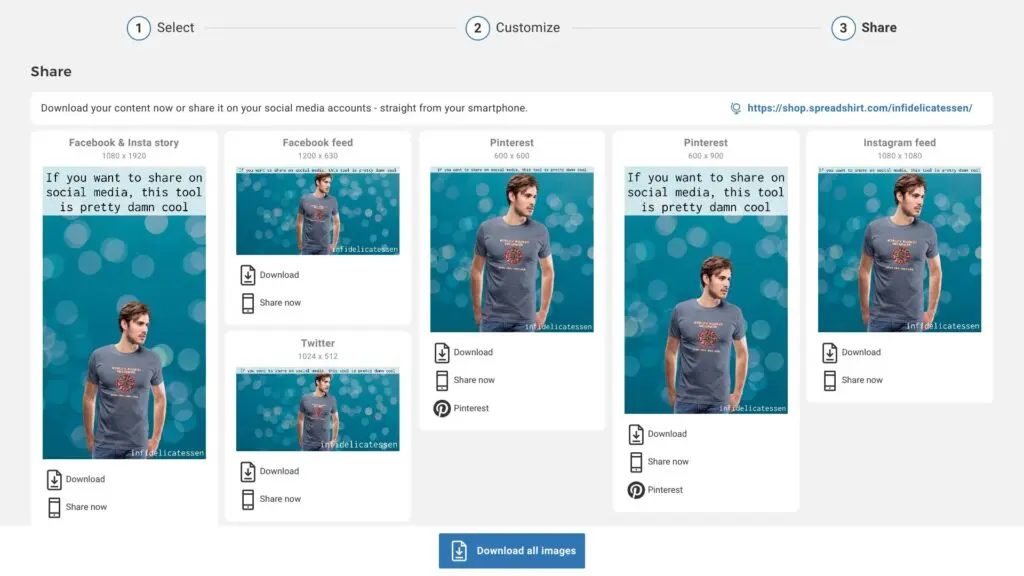 - Social Sharing Tool — With just a few clicks, you can create a mock-up image featuring a model wearing your gear against a custom background and some text in the image. Spreadshop then presents you with images sized for different social channels: Instagram and Facebook both get ready made images for Feeds and Stories, while there are also options sized for Twitter and Pinterest. You can download all these images at once to then post to social, or you can post directly to each channel without downloading using your mobile phone and QR code.