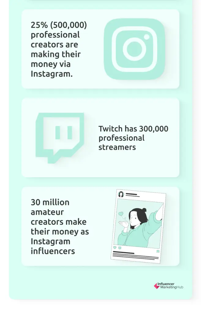 Many amateur creators still make some income thanks to their creativity, just it isn't enough for them to give up their day job. The largest group here (30 million) makes their money as Instagram influencers, although there is also a sizable number of YouTubers making some money (12 million).