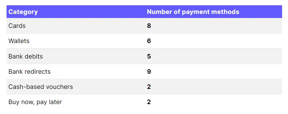 - Stripe currently supports a total of 32 payment methods: