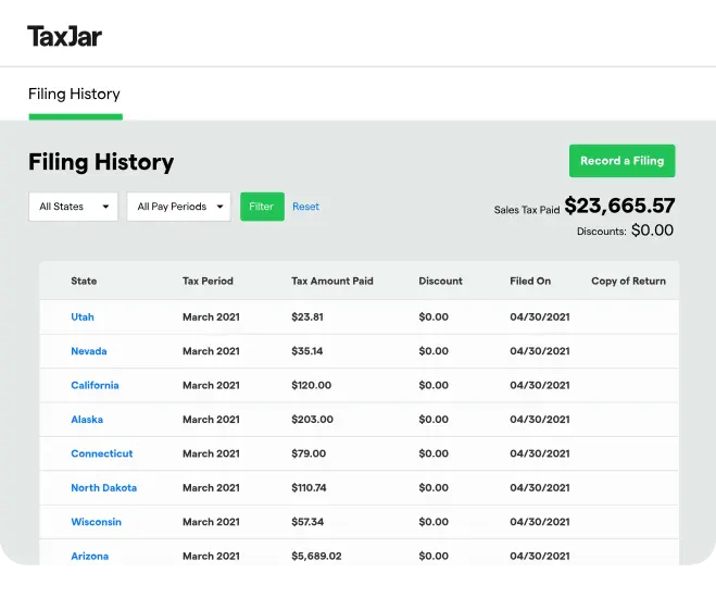 This is another huge timesaver from TaxJar. It goes beyond simply centralizing your payments onto a single platform. Everything in your state reports is there not just for you to see, but for the filing—and payment!—of the returns, as well. When you enroll in AutoFile, TaxJar will begin processing your return on the first of the month that it’s due. If you need to pay by April 15, the process starts on April 1. You’ll get an email notification detailing which states are getting paid that month, and you have some time to make sure there’s enough money in your connected banks account (and that all the numbers look good). As long as the return hasn’t yet been filed, you can pause or cancel it any time.