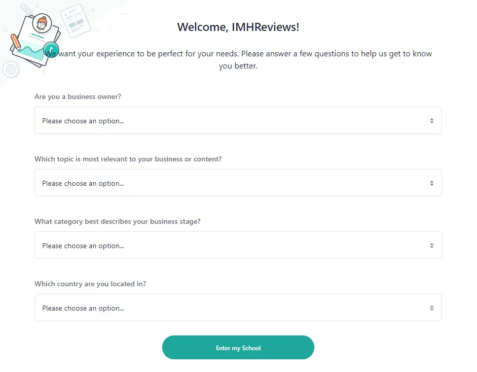 Once you’ve signed up and created your new school, Teachable, like other online course creation platforms, asks a series of on-boarding survey questions to get to know you better. Sure, these may seem a little intrusive, but they are designed to help improve the platform. And if you’re serious about creating an amazing online course that's competitive, helping the good folks over at Teachable by answering these questions is well worth it.