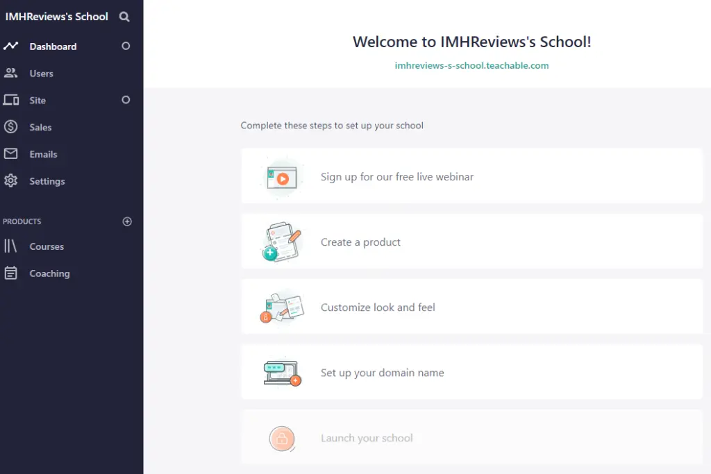 Teachable’s dashboard is the first screen you see after completing the on-boarding questions. It shows core features you'll need to launch your course. These include signing up for a free live webinar that covers how to create an online school and first course, how to use Teachable to accept payments, and how to create a beautiful school that matches your brand’s look and feel.