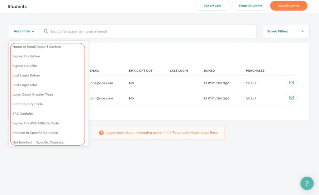 Users is where you’ll find all information related to people associated with your course. Users include students, owners, authors, affiliates, and anyone else you'd like to include. The Users section also comes with a filter and search bar to help you find people based on certain criteria. As far as filters go, Teachable’s thought of everything. While there are 33 filters available, we’ve created this shortlist is to illustrate how flexible Teachable’s filter feature is.