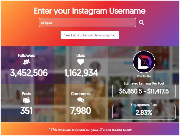 According to the Instagram Money Calculator, DrLupo has an average engagement rate of 2.83%. To put this into context, the average engagement rate on Instagram is between 1% and 3.5%. So his engagement rate is towards the higher side.