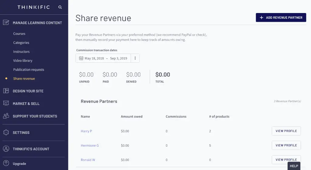 In this section, you can create a revenue partner, determine what they receive revenue for, and assign a percentage they are paid.