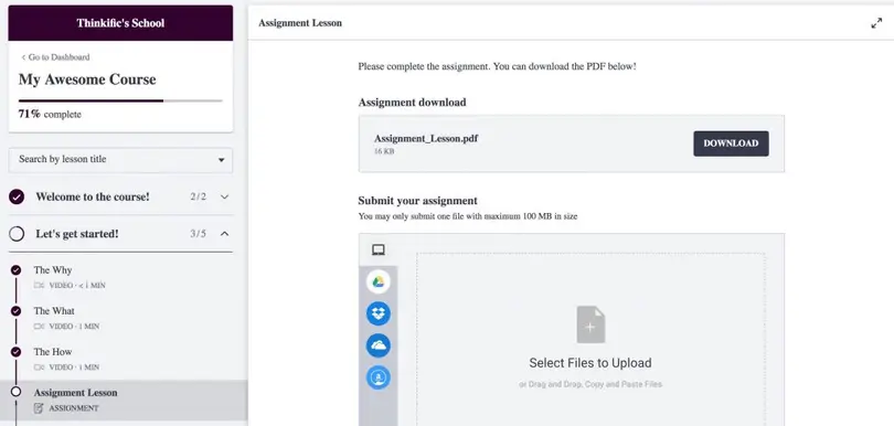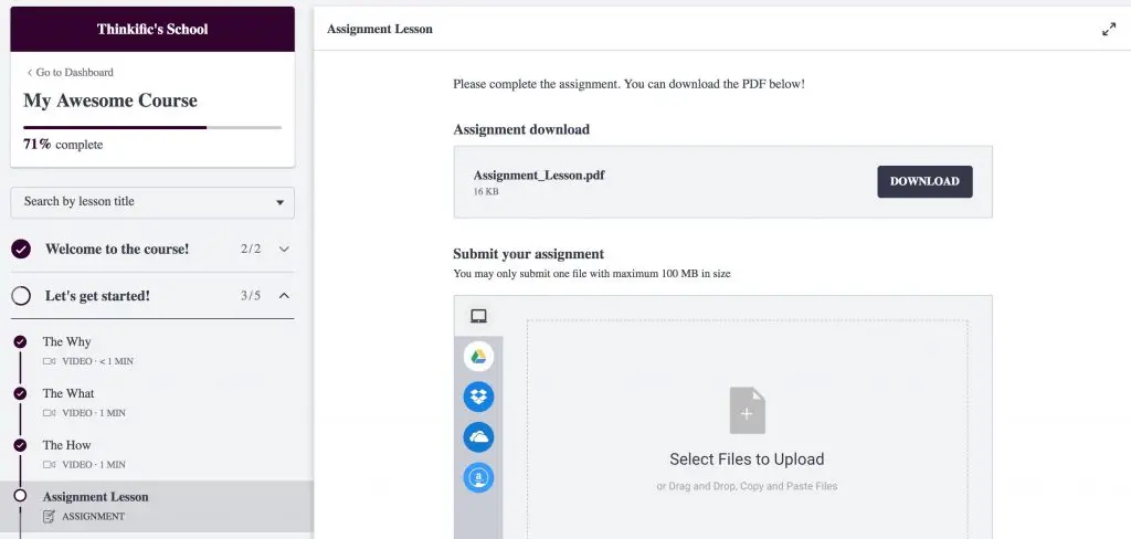 Assignments are a great way to engage students. They help test how well students have grasped new knowledge and consumed course content. Creating them is easy. Assignments are created in the Curriculum area while building out your course. You can upload an assignment lesson, and once created, students will be able to download, and submit their assignments through their accounts.