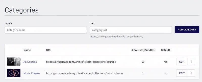 Categories are a smart addition to Thinkific's dashboard. They become available when you have published at least two courses and allow students to sift through courses for classes on similar topics. You can add and remove categories, add a category image, add courses and remove, and edit categories.