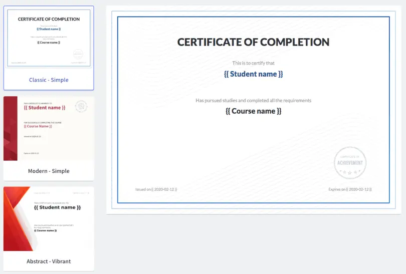All you need do is select a template, customize it, and assign it to your course. You're also able to access certificates for students, edit them, view a certificate history, and re-issue certificates if need be.