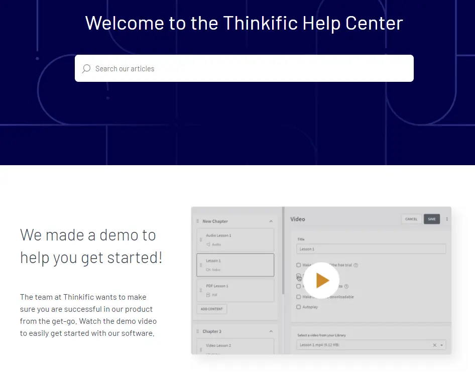 Thinkific’s help center is likely where you'll spend most of your time looking for any questions about how the platform works. And it's helpful. You'll have access to a collection of demos, insightful articles, and everything you'll need to launch your course.