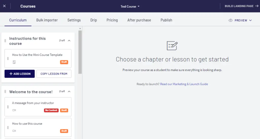 Thinkific has the ability to preview your course. Typically, most platforms offer a preview of a specific page or a limited preview of what students will see. Thinkific offers two options. You get to see all course lessons and the course as an enrolled student.