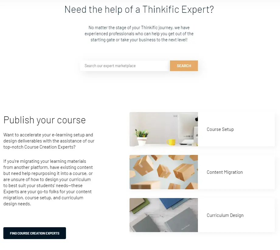 While Thinkific has done a great job of creating as many helpful resources as possible to help you create your course and site, it also offers the Expert Marketplace. It's where you can go to get help with publishing your course, designing your site, enrolling students, and customizing your course.