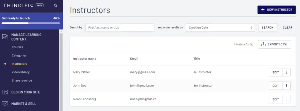 The instructors page also allows you to search for instructors by first or last name or title. You also have a filter feature that allows you to arrange results by first or last name. If for some reason you need to export a list of your instructors, you have the option of doing so in CSV file format. And if you need to edit instructor details, the Edit button next to an instructor’s profile makes it possible.