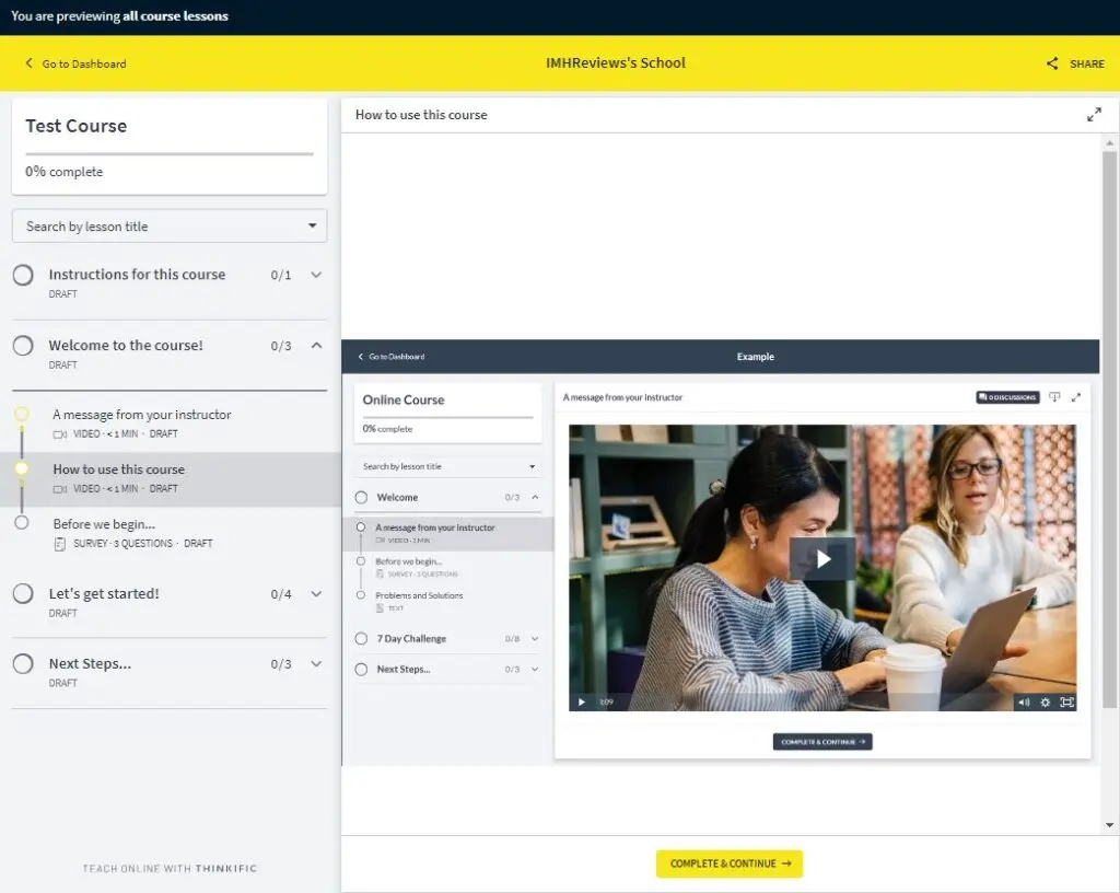 Finding a complete course example from Thinkific is a little challenging. Access to courses often requires a sign-up. To get a look at what courses can look like, we recommend signing up for a free account with Thinkific and going through the example in your admin dashboard. It includes the entire experience and gives you all the insight you need. Also, be sure to check out the Courses and Managing Learning Content sections of this Thinkific review.