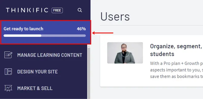 Thinkific's dashboard also comes with a handy progress bar. As you build out your course, the course progress bar is measured as a percentage towards getting ready to launch. As far as the building experience goes, this transforms the idea of creating a course from a seemingly challenging one to a fun, light, and exciting undertaking.