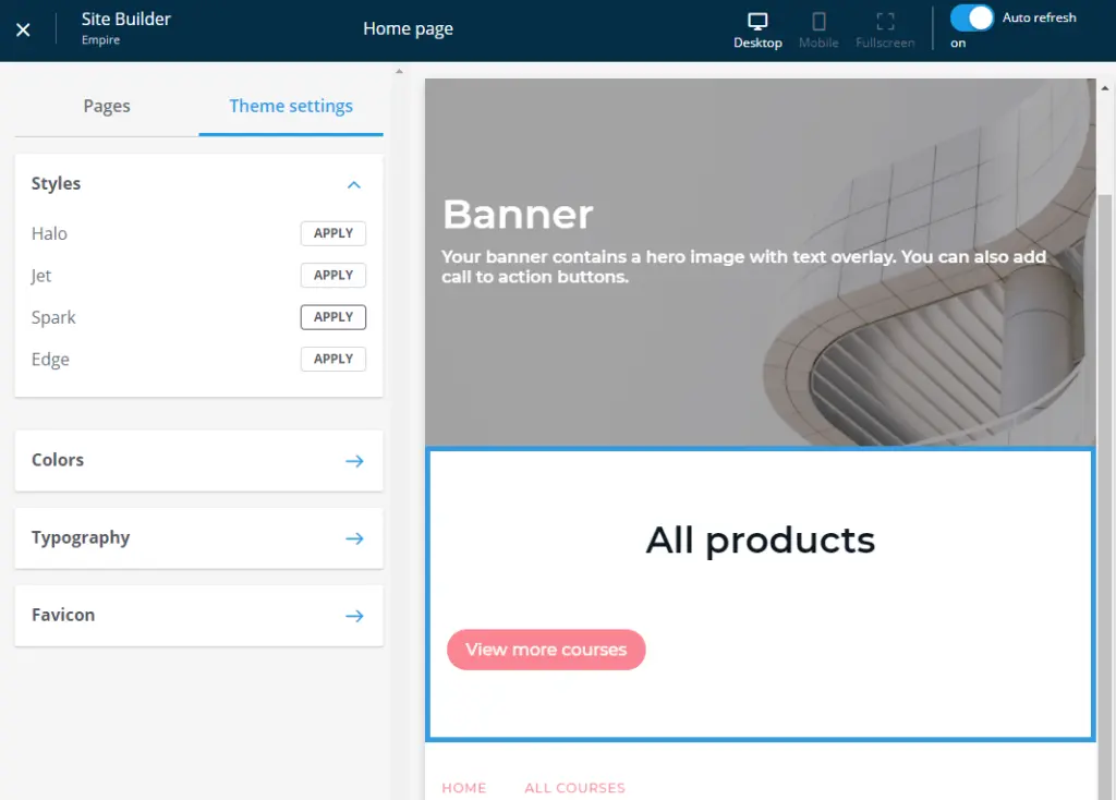 This approach to site design has pretty much become the standard for online learning platforms. It simplifies the complexities of web design, making the process easy to complete. In the left-hand editing panel you can add and edit everything from header, banner and product sections to headings, buttons, body text, and images on your site.