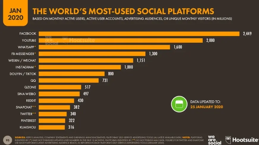 The report lists the world's most used social platforms, ranked by monthly active users. Facebook still tops this list with 2,419 million users as of January 25, 2020. YouTube follows with 2,000 million uses. WhatsApp is third with 1,600 million, Facebook Messenger fourth with 1,300 million, Weixin/WeChat fifth with 1,151 million, and Instagram sixth with 1,000 million. TikTok now takes the seventh spot with 800 million followers.
