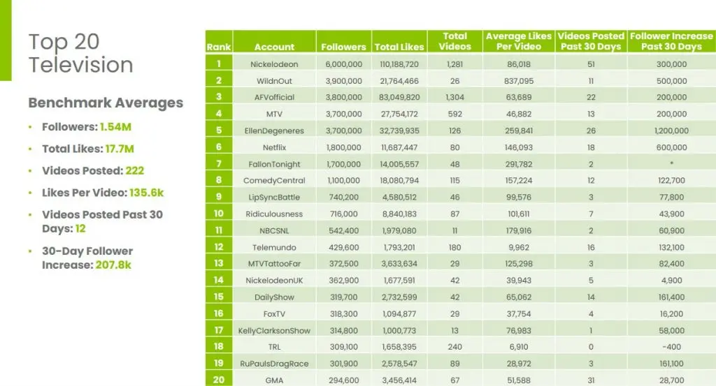 TikTok’s appeal to the younger generations come very clear when you see that the most popular television account, by far, is for Nickelodeon, with 6,000,000 followers. This compares to second-placed WildnOut’s 3,900,000 followers. The difference in video output by those two channels is stark. Nickelodeon has uploaded 1,281 videos, averaging 86,018 likes per video. WildnOut has only uploaded 26 videos, earning them an incredible 837,095 average likes per video.