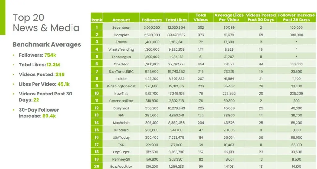 The top 20 news and media accounts on TikTok average 754,035 followers. They average 12,301,922 likes. Each of these accounts has posted 248 videos on average, giving them an average of 49,181 likes per video.