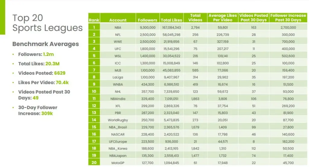 By far the most popular sports league on TikTok is the NBA, with 9,300,000 followers and 167,084,343 likes. Their 59,801 average likes per video are lower than some other sports leagues, primarily because they have released more videos (2,794). For example, the second most followed league on TikTok is the NFL with 2,500,000 followers and 58,045,298 total likes. They have only uploaded 256 videos, however, giving them 226,739 average likes per video.