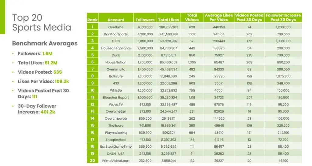 The top 20 sports media accounts on TikTok average 1,594,320 followers. They also average 61,231,565 likes. Each of these accounts has posted 535 videos on average, making them one of the more prolific niches of accounts analyzed by Conviva. This gives them an average of 109,162 likes per video.