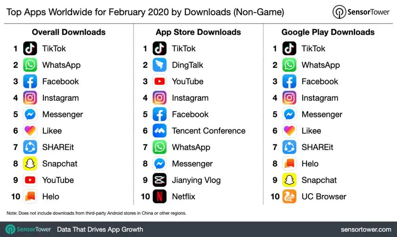 TikTok's downloads have grown phenomenally over the last few years. Although downloads have significantly varied from month to month, there have been months when TikTok was the most downloaded non-gaming app in the iOS App Store. According to Sensor Tower estimates, TikTok had 18 million iOS downloads in February 2020.