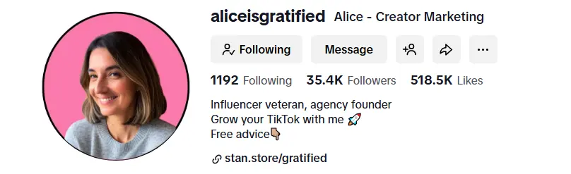 Use concise language that highlights outcomes, formats, or value rather than background details. For instance, take a look at this TikTok bio from @aliceisgratified on TikTok: