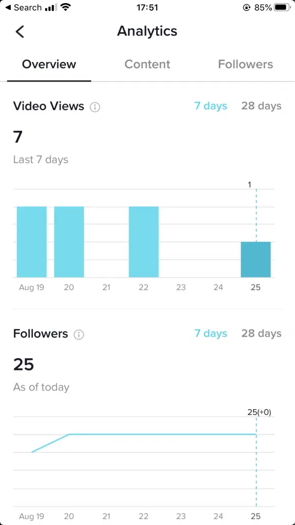 Your profile overview on analytics will summarise total video, profile views, and follower count with an analysis of these views over the past 7 or 28 days. This information can also be found on a day-by-day basis. By digging into follower insights, you can see more clearly which videos on which days aligned to follower growth. This will help you inform your user engagement strategy going forward and make the necessary learnings on where you’re going wrong.