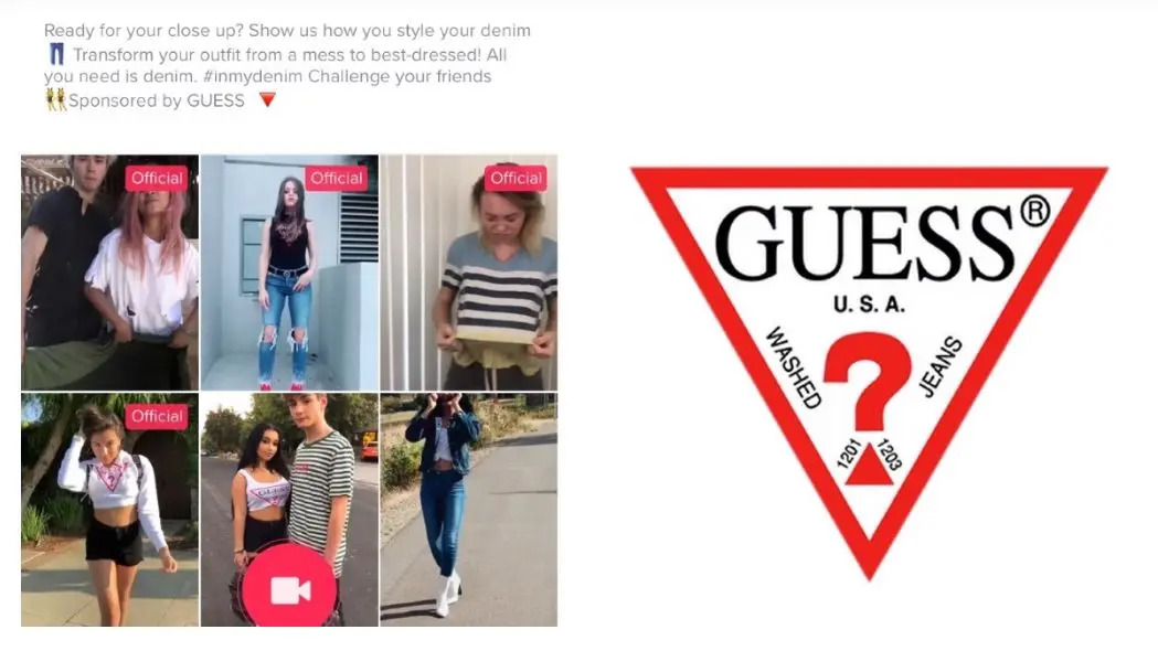 If you're afraid your hashtag challenge won't take off like you want to it, you can also buy a hashtag challenge ad on TikTok. The first brand to ever do this was fashion label Guess with the #InMyDenim challenge. Every user that opened the TikTok app was directed to the challenge which Guess kickstarted with popular, and influential content creators such as @ourfire (2.3 million fans) and @madison_willow (+983 000 fans). The #InMyDenim challenge received viewed more than 36 million views.