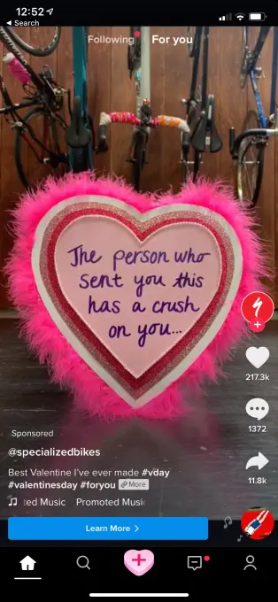 A third way to use advertising in TikTok is with in-feed native video ads, which TikTok was recently caught testing subtly in the app. The test was spotted in the US version of the app, where a video labeled “Sponsored” from the bike retailer Specialized showed up in the main feed, along with a blue “Lean More” button that directs users to tap to get more information.