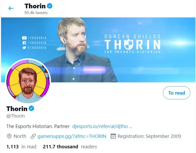 Duncan Shields, popularly known as Thorin, is an esports journalist from the United Kingdom. He is a popular esports influencer, and is known as “The Esports historian.” He specializes in Quake, Counter-Strike, League Of Legends, Overwatch, and StarCraft.