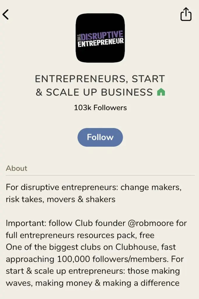 Entrepreneurs, Start & Scale Up Business is currently one of the largest groups on the platform boasting more than 100,000 followers. The room’s subjects include business, entrepreneurship, podcasting, and mindset. You can also follow Rob for more info about new rooms.