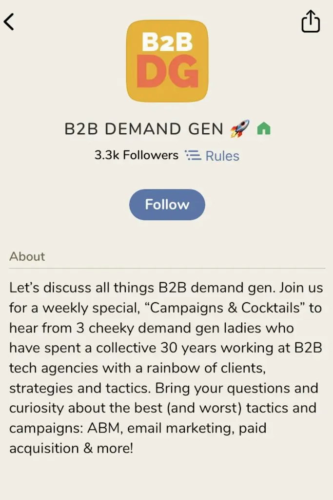 The B2B Demand Gen club on Clubhouse hosts a weekly event, “Campaigns & Cocktails”. The ladies behind this weekly special boast three decades of experience among them and have worked mainly with B2B tech agencies. So, if you ‘re specifically searching for B2B marketing advice, be sure to add Wednesdays at 4 p.m. PST to your calendar.