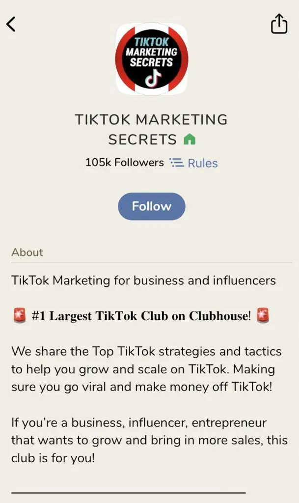 On top of having the biggest TikTok club on Clubhouse, he also has 6 other clubs that focus on the other main social media channels, influencer marketing, and growth hacking. Whether you’re a business, an entrepreneur, or an influencer, you definitely want to follow him.