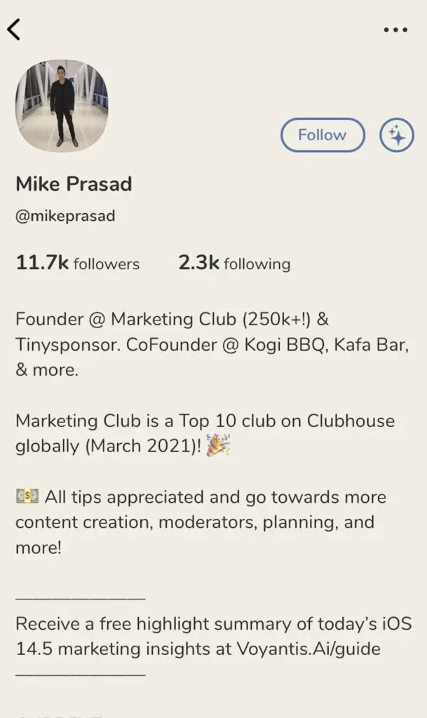 Mike Prasad is the founder of Tinysponsor, the biggest creator-first marketplace for influencer and content sponsorships in the world. On Clubhouse, he has grown his Marketing Club community to more than 250,000 followers. In fact, in May 2021, Marketing Club was ranked the Top 7 club on Clubhouse.