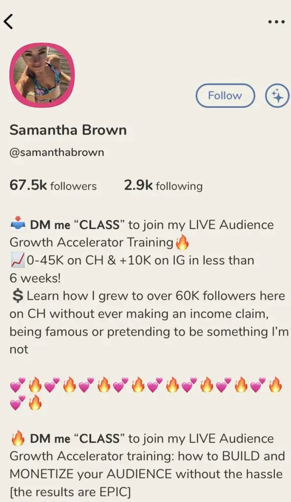 On Instagram, Samantha describes herself as a “Clubhouse Queen”. She managed to get 45,000 followers in fewer than 6 weeks and is fast approaching the 70,000 milestone. She mainly offers LIVE audience growth accelerator training.
