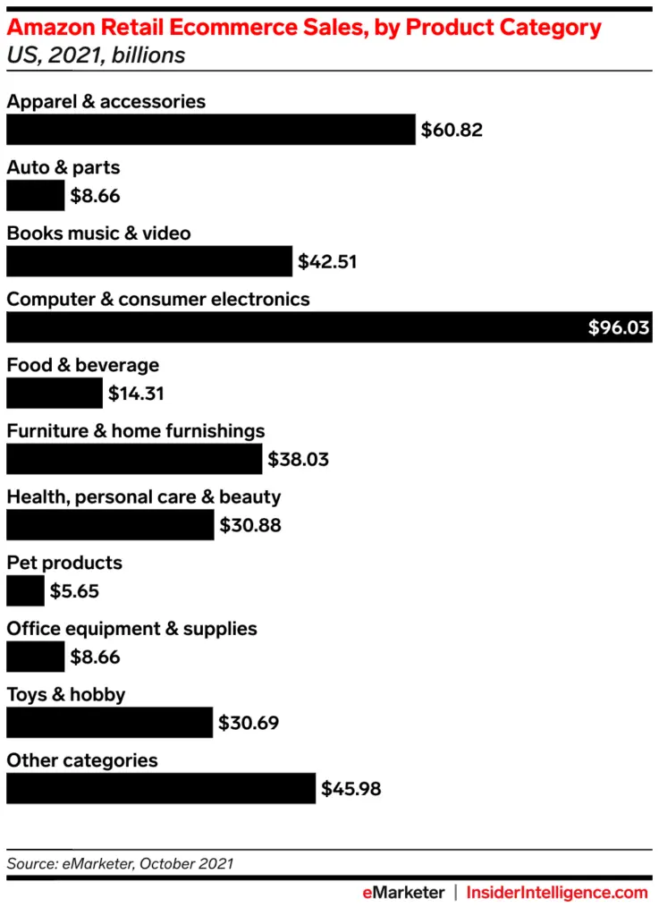 Amazon's dominance in the eCommerce space is unparalleled. According to the latest research, Amazon was ranked as the world's most valuable retail brand, with a brand value of around $683.8 billion. In 2021, here's how the brand fared with respect to retail eCommerce sales by category: