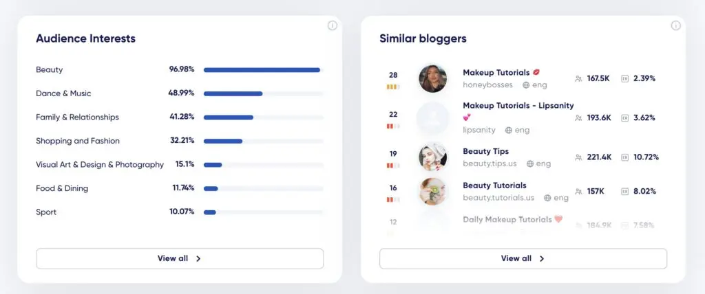 The good news here is that, in the even you find a small disqualifier in an influencer analysis report, you can use the lookalike search to find someone similar. trendHERO’s AI uses over 1,000 data points to analyse and compare profiles, then presents similar ones to you, complete with a score of just how similar they are.