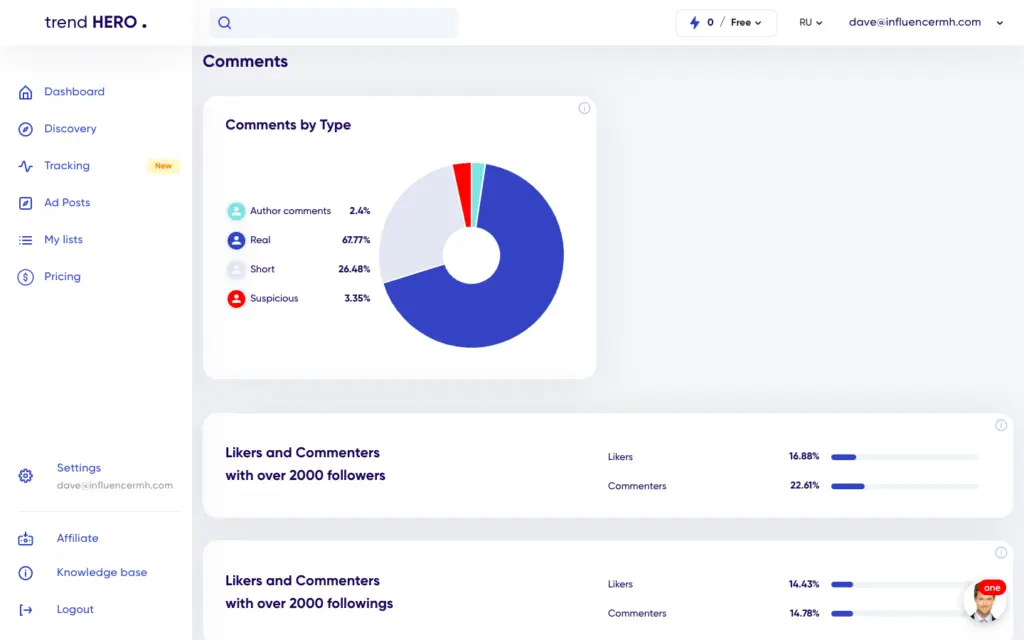 • Blogger, $15.99/mo — trendHERO is a Ukrainian company, so the naming of this plan “Blogger” is a bit of a cultural artifact. The platform doesn’t monitor bloggers or blogs, only Instagram, and this plan is geared towards the creators who want to monitor their own accounts, or small businesses with minimal needs. In addition to the basics of the Free plan, this one gets you: influencer discovery, 10 reports/mo, tracking up to 3 accounts, unlimited lists, likers and active audience analysis, ad efficiency. A nice touch: if you run less than 10 reports, they balance rolls over to the next month.